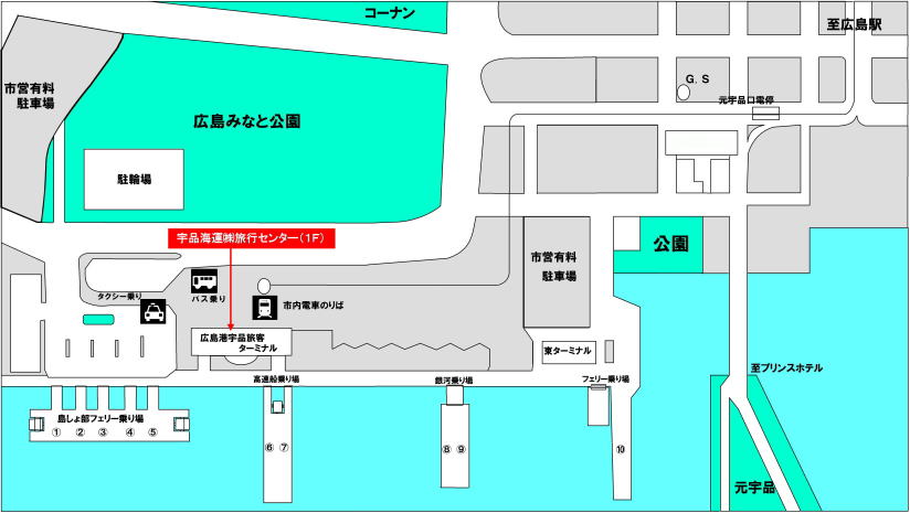 お問い合わせ・お申込みは 宇品海運株式会社 広島県知事登録旅行業第2-5号 〒734-0011 広島市南区宇品海岸1丁目13-26 広島港宇品旅客ターミナル1階 旅行センター TEL(082)255-3533 船客課 TEL(082)251-5191 共通 FAX(082)251-5195 ✉ u-kai@abeam.ocn.ne.jp ※メールでのお問合せ及びお申込みのご回答は、翌日(土日祝の場合は、月曜日または祝日の 翌日)になる場合があります。お急ぎの方は、お電話またはご来店にてお願いいたします。 【営業時間】 ■旅行センター 平日 9:00~18:00 土曜日 9:00~17:00 ※日曜日・祝日は休業日 ■船客課 毎日 9:00~18:00 【旅行代金のお支払について】 旅行代金のお支払いは、弊社にて現金のお支払または事前の銀行振り込みとなります。 ※振込手数料はお客様負担となります。 クレジットカード等でのお支払はできませんので、予めご了承ください。 ◆松山ビジネスプラン(ホテル、レンタカー)の場合 ご予約は、前日の16:00までにお願いいたします。 当日でも空室、空車がある場合は、ご予約を承れる場合もありますが、その場合は旅行 センター営業日の16:00までにお申込みください。 ◆みやじマリンパックの場合 ご旅行当日に、宮島行き高速船の切符発売窓口にてご購入下さい。(現金のみ) みやじマリンパックのご予約は必要ありませんが、広島~宮島の高速船の予約が必要な 場合があります。 広島~宮島の予約は、前日までは瀬戸内シーラインTEL(082)254-1701、 当日は弊社船客課TEL(082)251-5191で承ります。 ■広島港宇品ターミナルの周辺地図